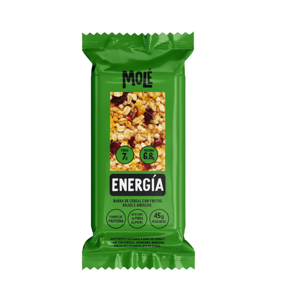 Descubrí una opción saludable y práctica para tu día: la Barrita con frutas MOLE – ENERGÍA. Con 45g netos, aporta 7,4g de fibra y 6,8g de proteína vegetal. Rica en Vitamina B12, es fuente de energía natural, libre de refrigeración y apta Kosher. Ideal para quienes buscan nutrirse con ingredientes seleccionados como avena, maní, frutas deshidratadas y soja texturizada.
